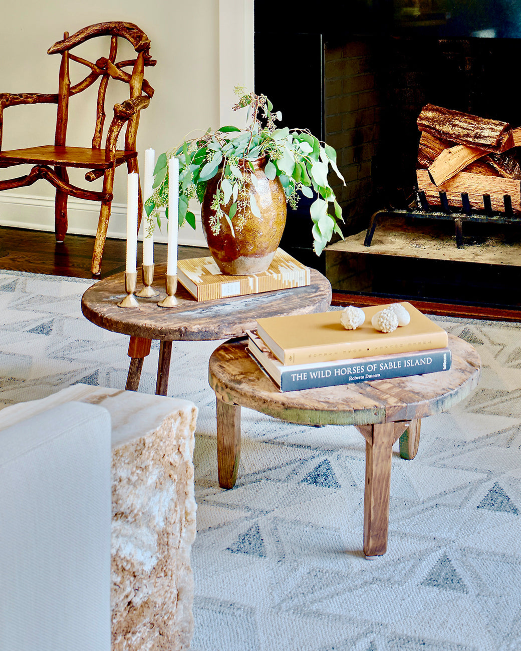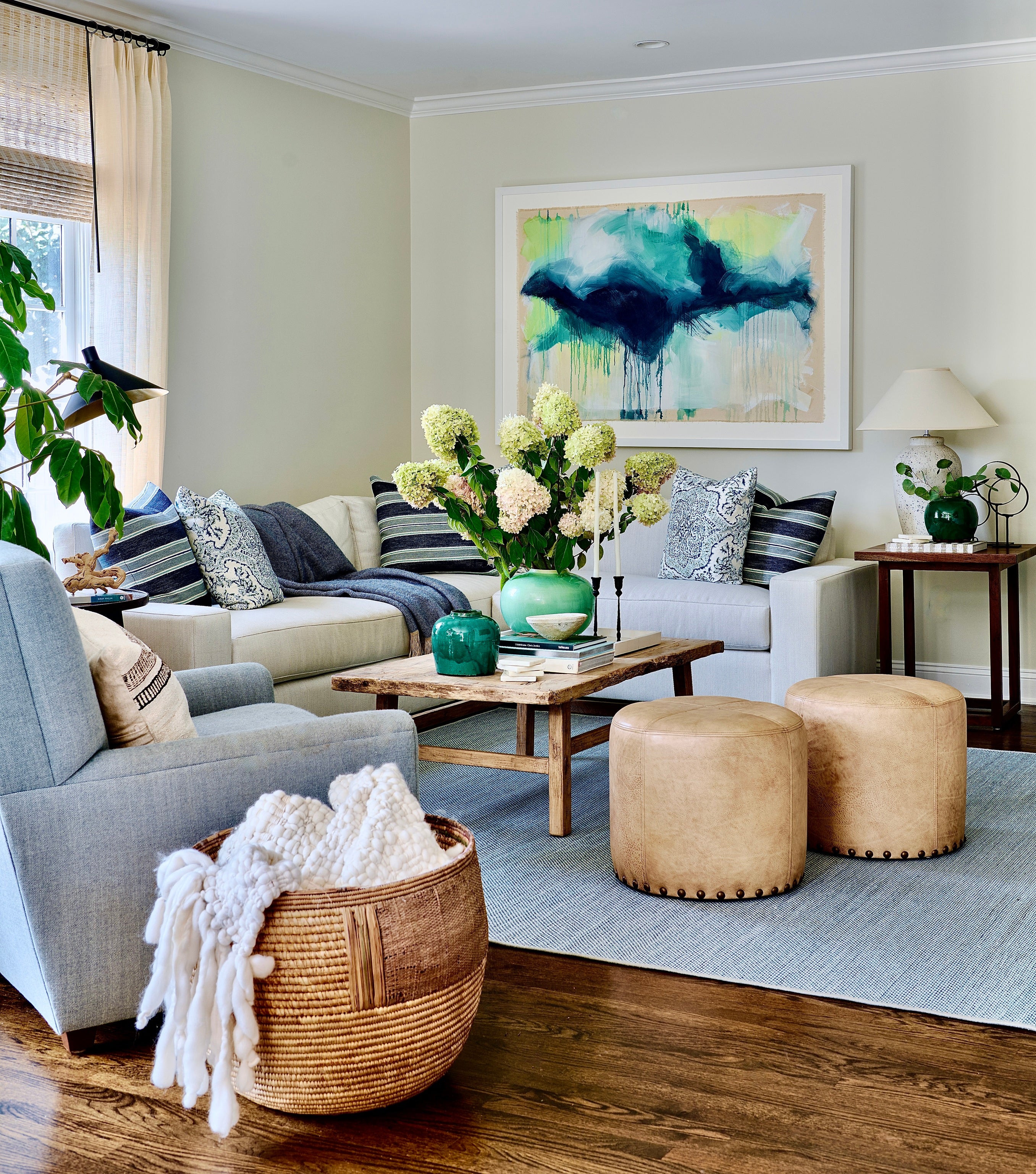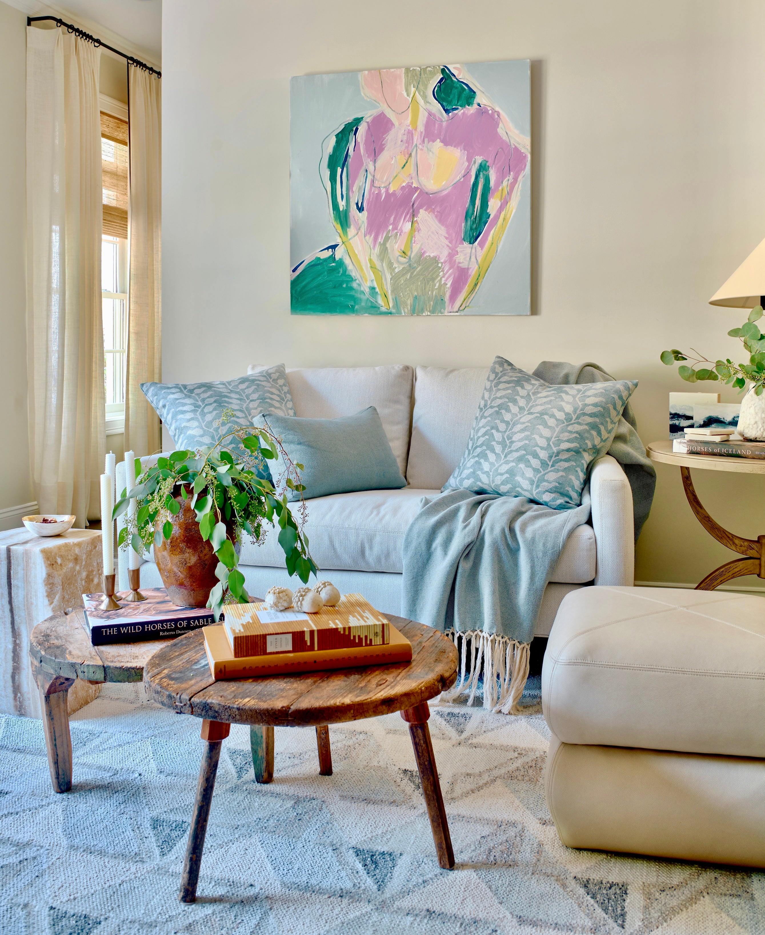 Décor was layered to strike a balance between comfort and sophistication. A modern Scandinavian wool rug in washed blues, soft greens, grays, and cream both anchored and brightened the space. Textured linen pillows, woven throws, and unique finds—such as a European root chair and vintage wine-tasting tables—added character and grounded the design. Custom furniture and an artist-commissioned painting introduced personal, modern touches that made the home distinctly its own.