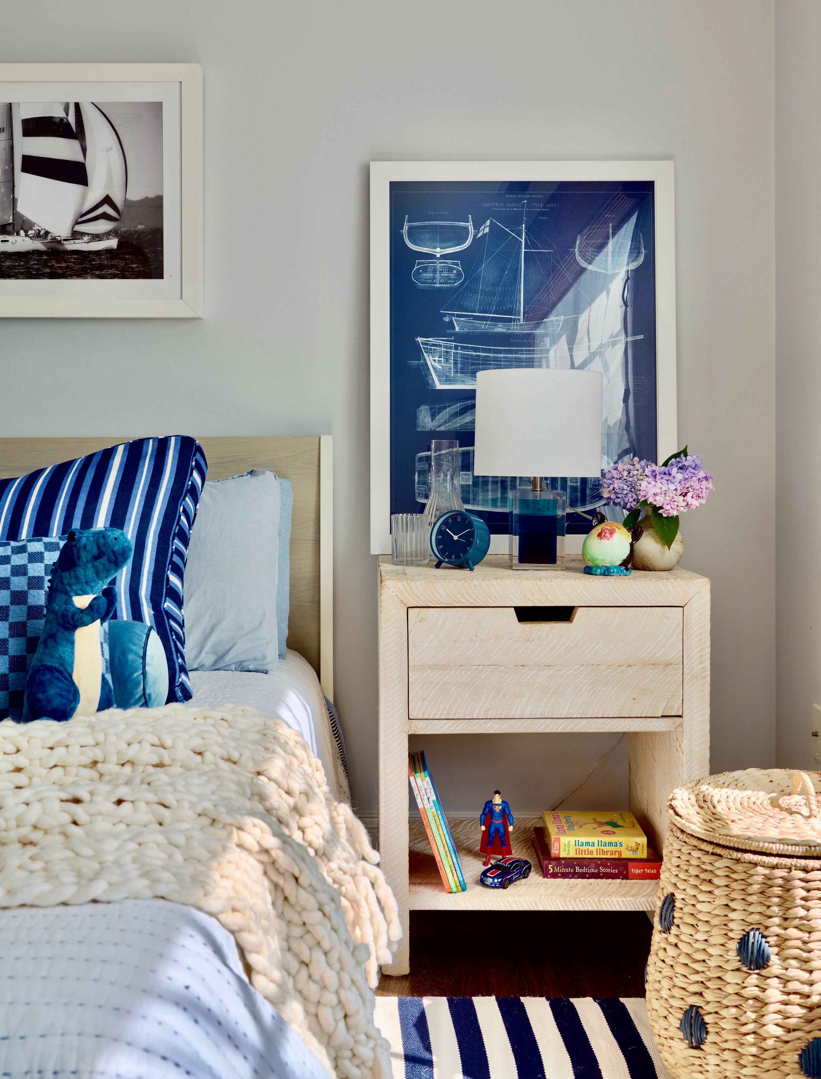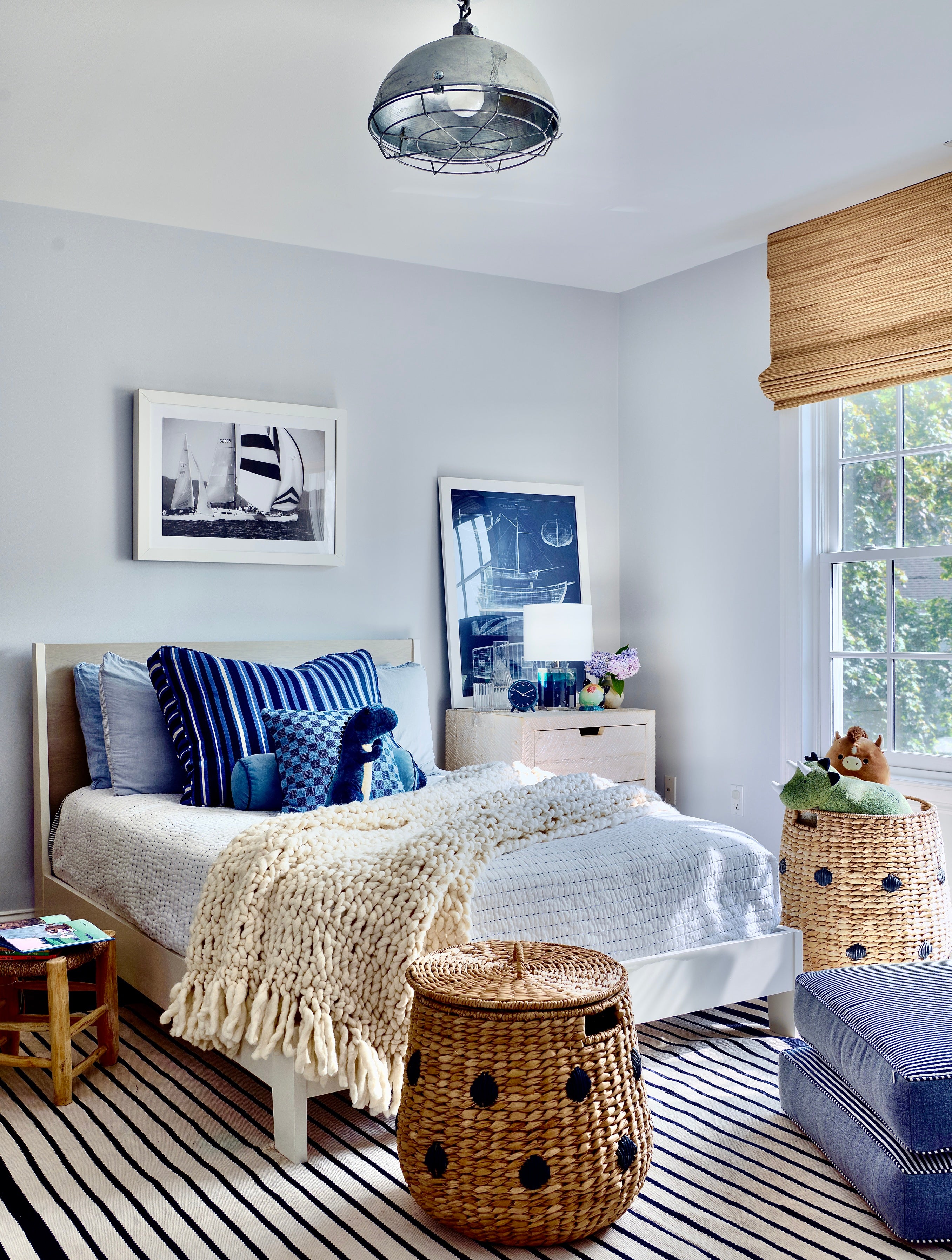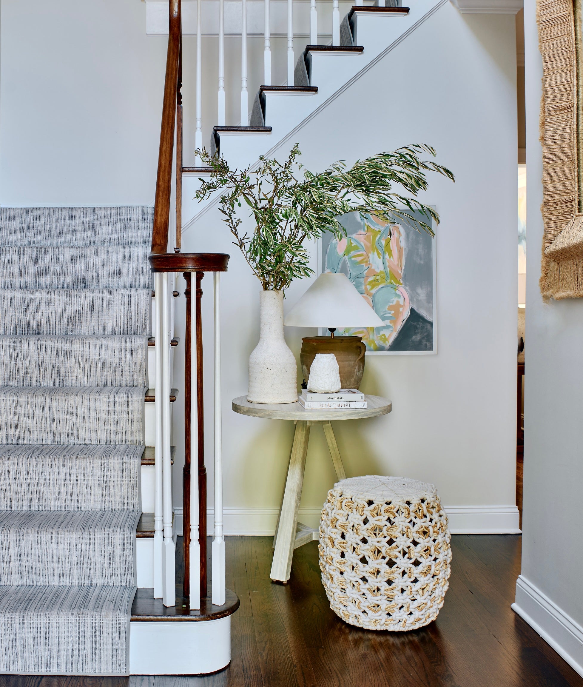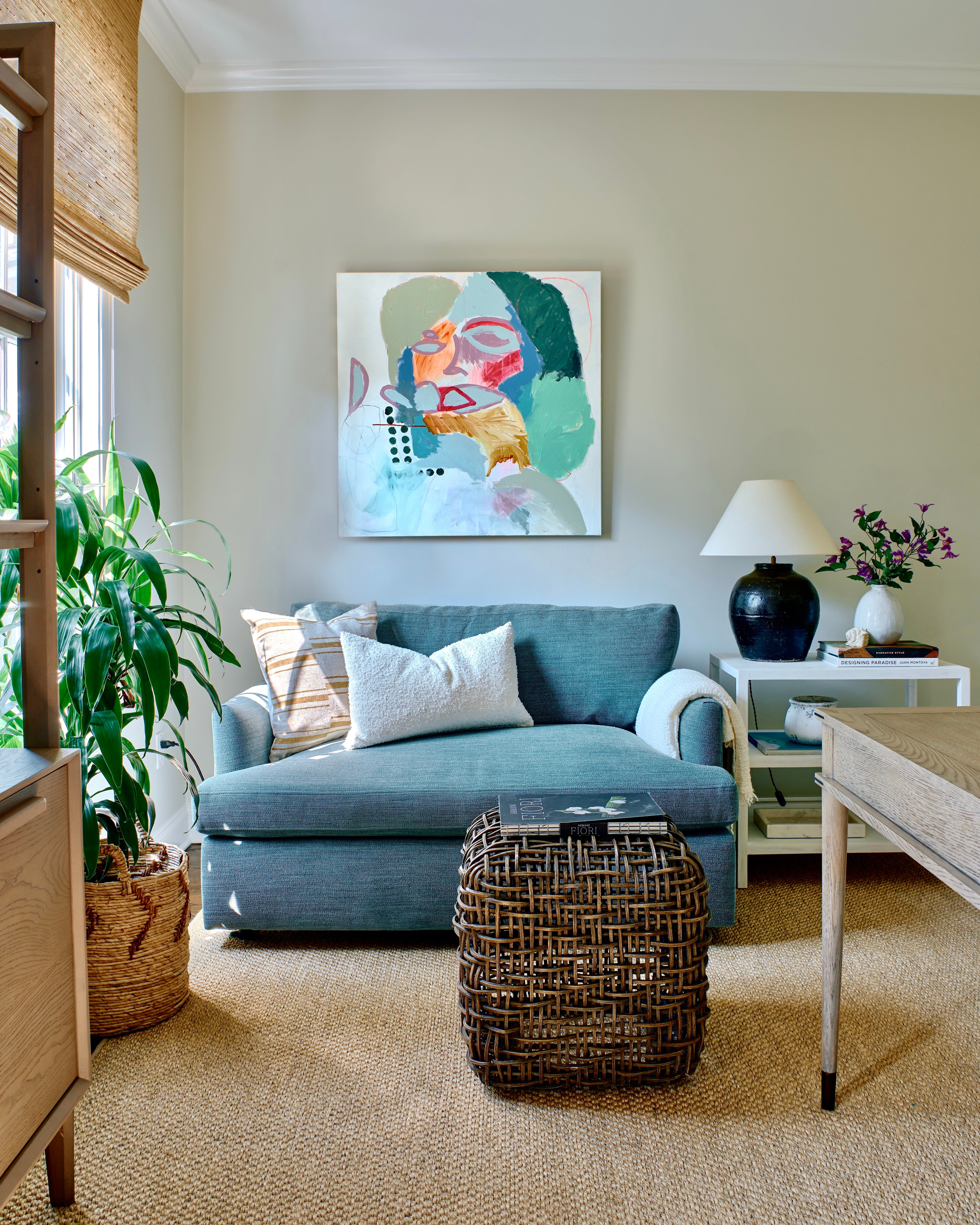 Décor was layered to strike a balance between comfort and sophistication. A modern Scandinavian wool rug in washed blues, soft greens, grays, and cream both anchored and brightened the space. Textured linen pillows, woven throws, and unique finds—such as a European root chair and vintage wine-tasting tables—added character and grounded the design. Custom furniture and an artist-commissioned painting introduced personal, modern touches that made the home distinctly its own.