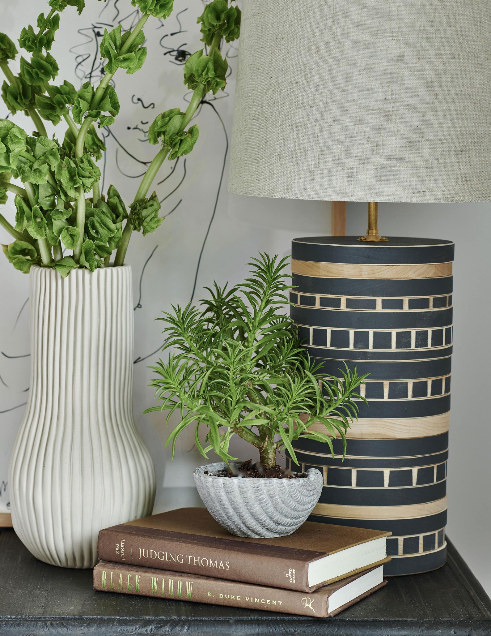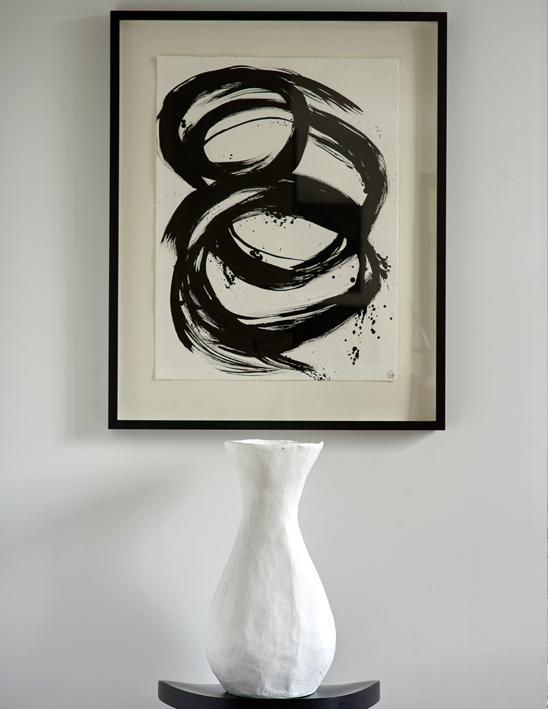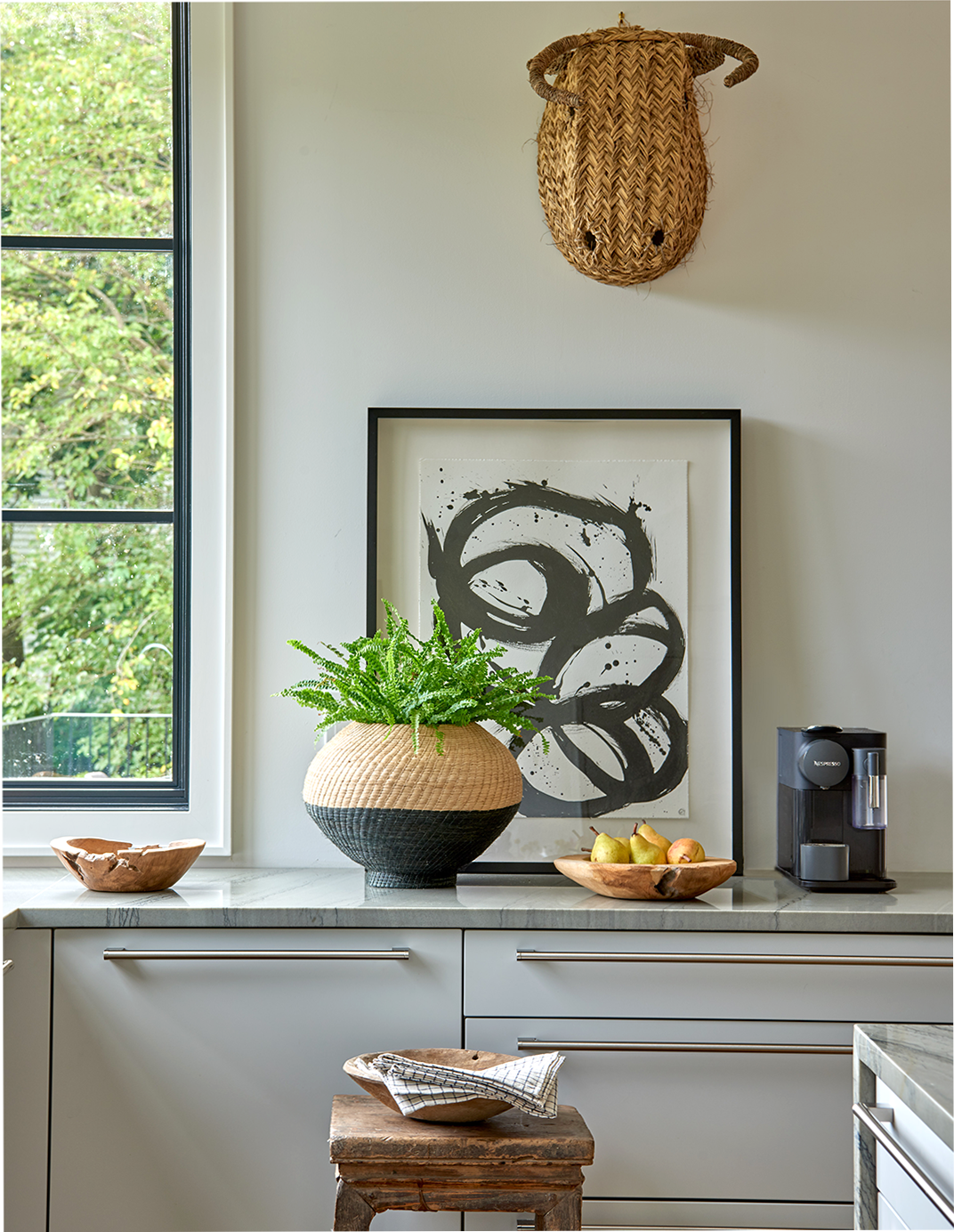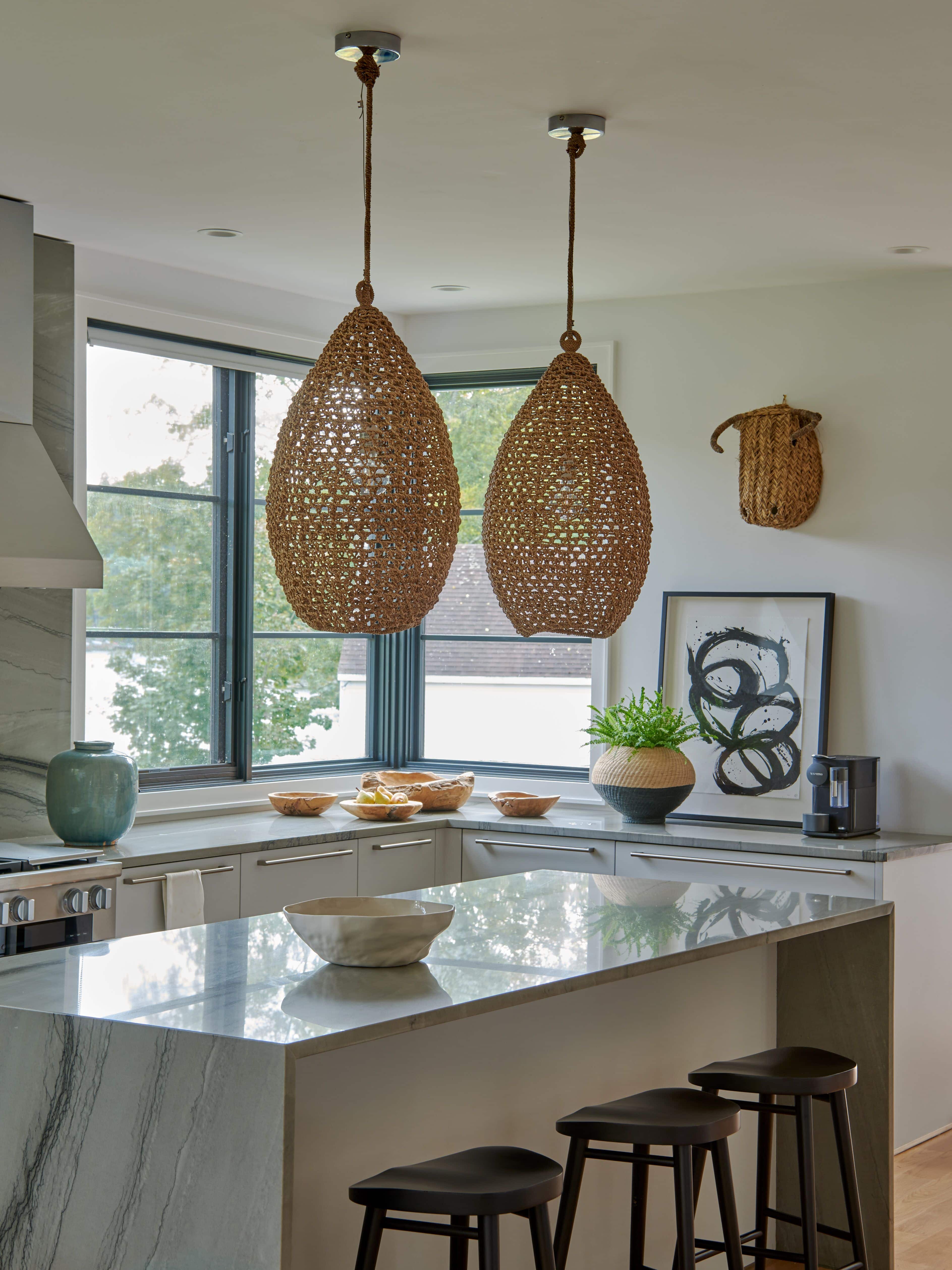 Organically shaped rattan pendants, chosen to balance the modern stone, were the inspiration for our design.