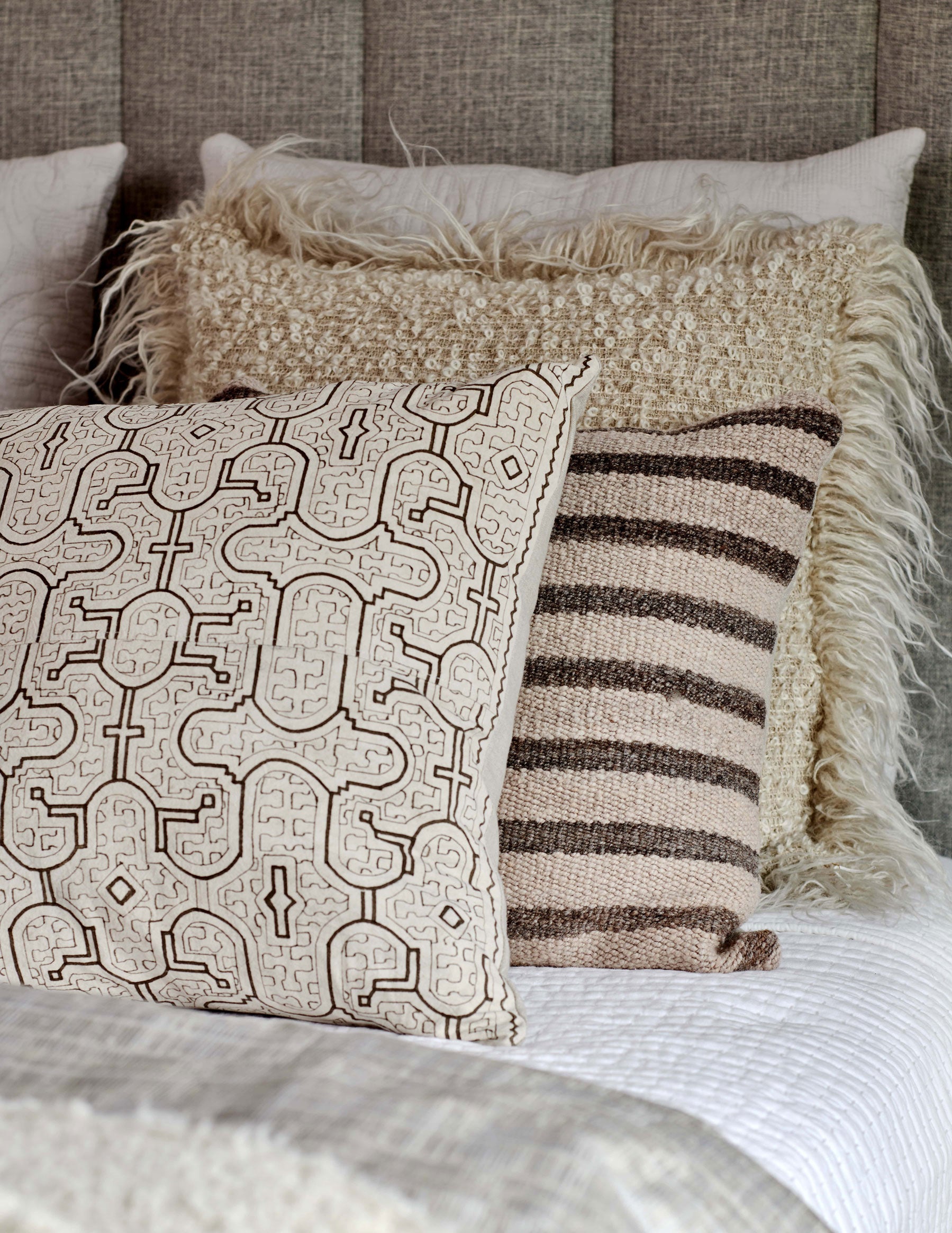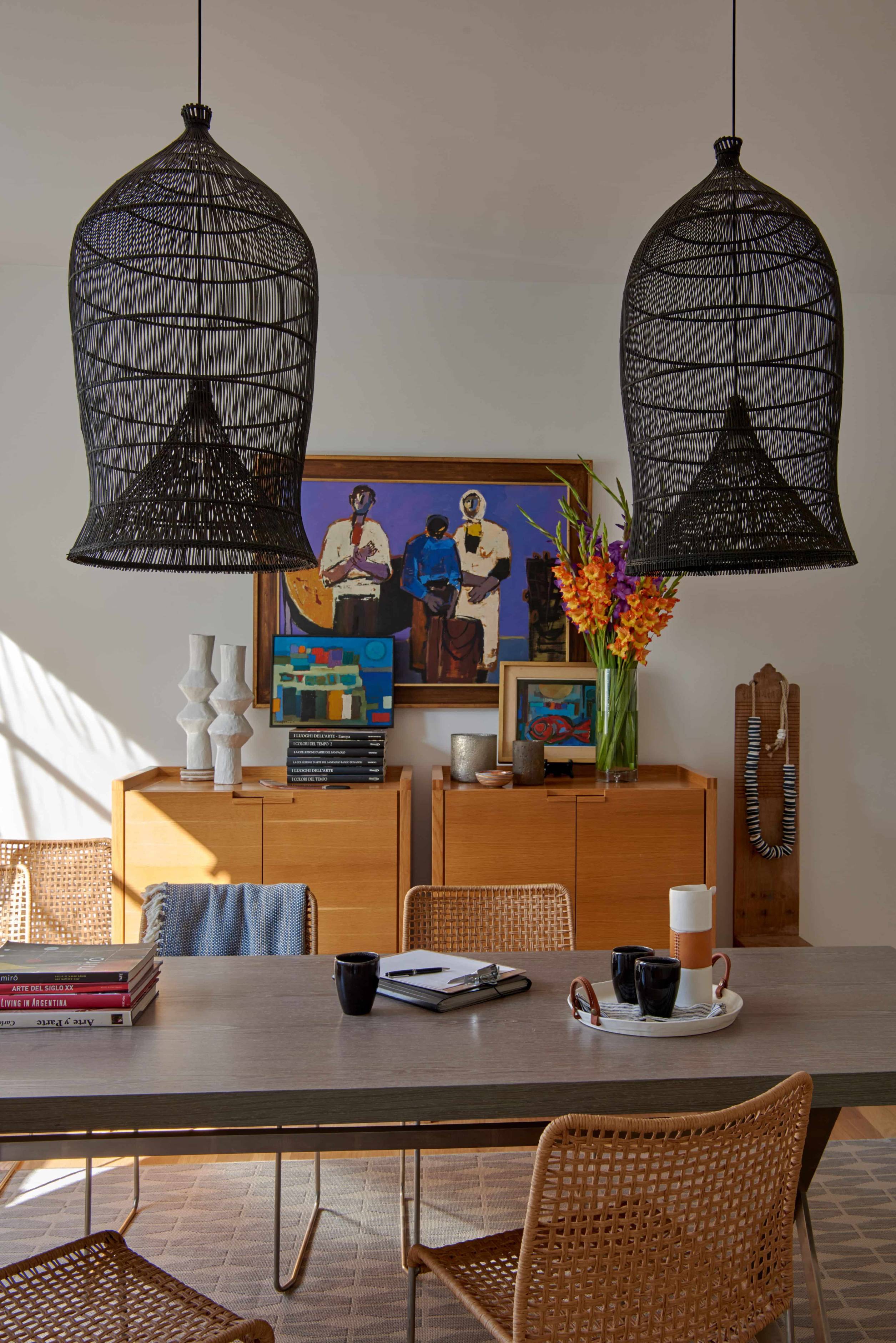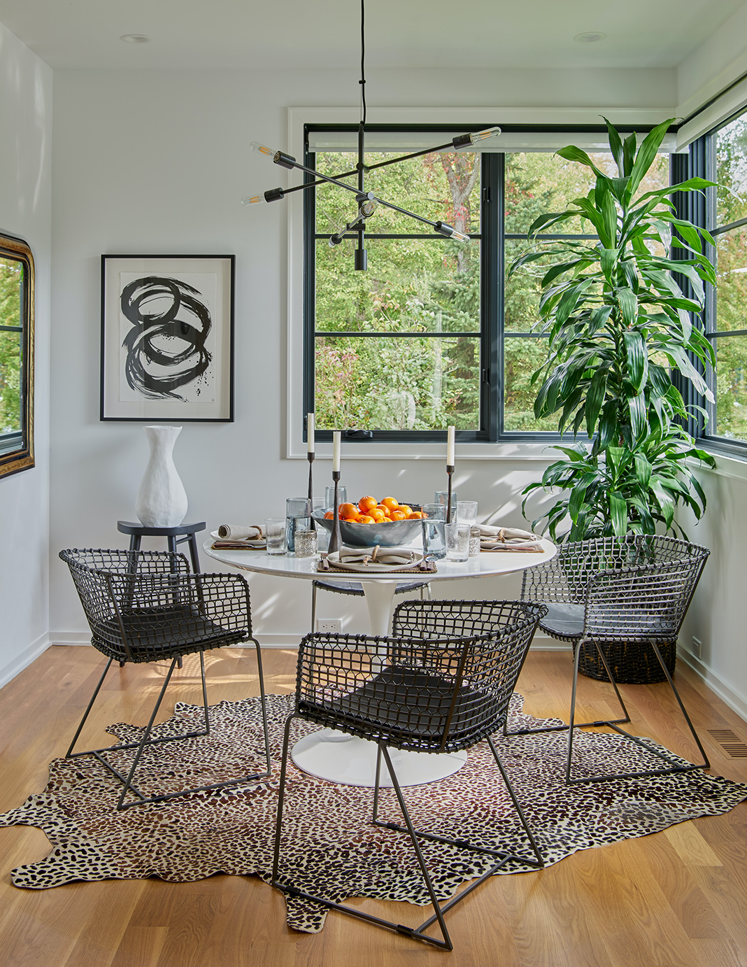 Hand-woven poufs, crafted after Columbian hats, added an understated whimsy that made the living room complete. Round swivel chairs allowed enjoyment of the interior and exterior spaces. The eat-in kitchen featured iron-mesh chairs with leather cushions surrounding a glossy Saarinen table. The use of mixed materials created seating that was both functional and gorgeous. Our inspirational pendants were then added to the kitchen, giving warmth and a touch of the unexpected.